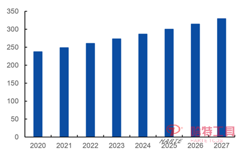 全球金屬切削工具市場規模達到237.3億美元,預計在2020至2027年間將保持4.8%年復合增長率,并在 2027年達到 329.5 億美元。中國刀具消費規模在2005至2020年間保持7.75%年復合增長率,2020年約為421億元。考慮制造業轉型升級趨勢不改,“十四五”期間刀具消費市場有望迎來進一步增長,邁上新的臺階。